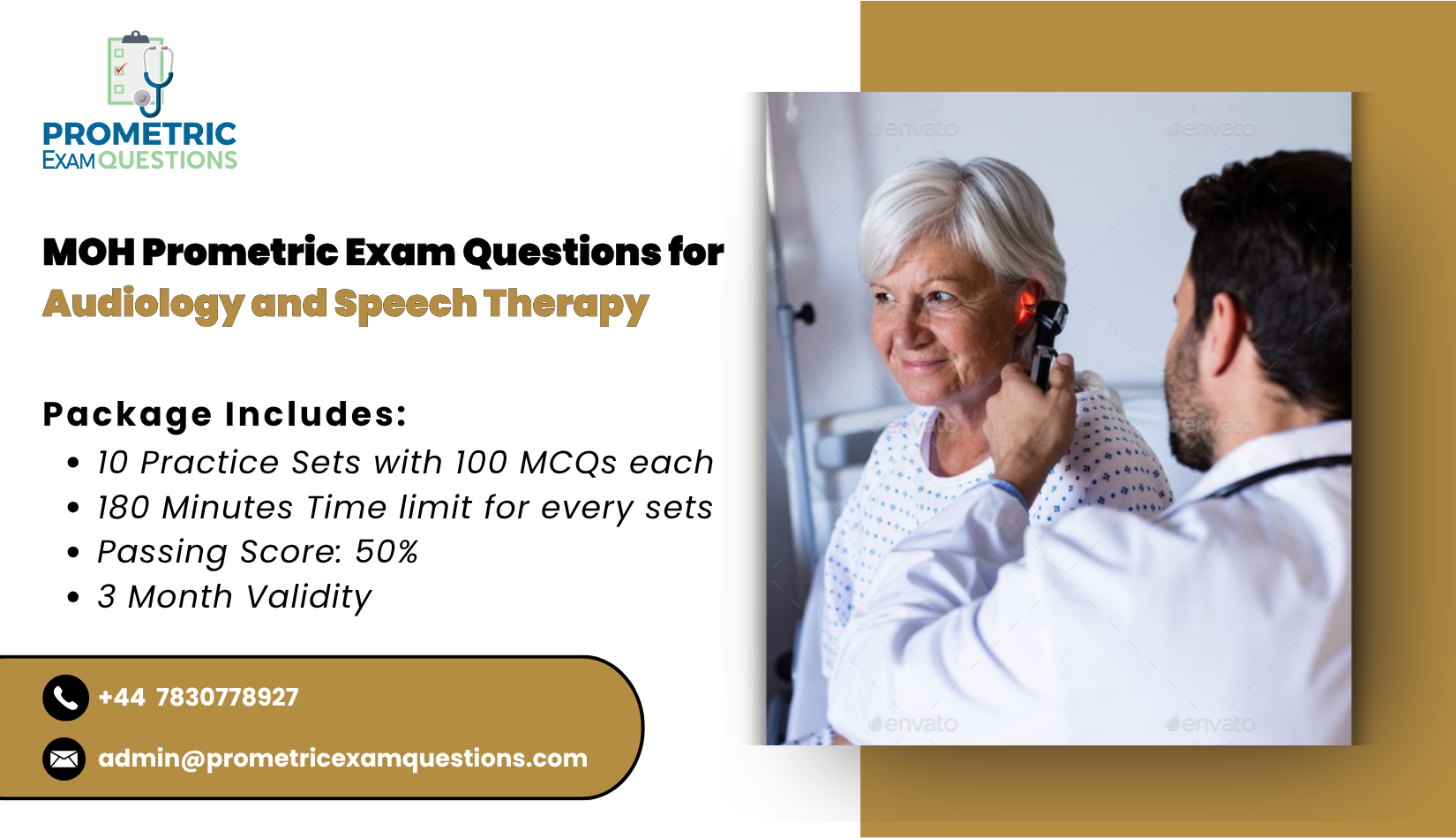 - MOH Prometric Exam Questions for Audiology and Speech Therapy consists of 10 Practice Exam Sets